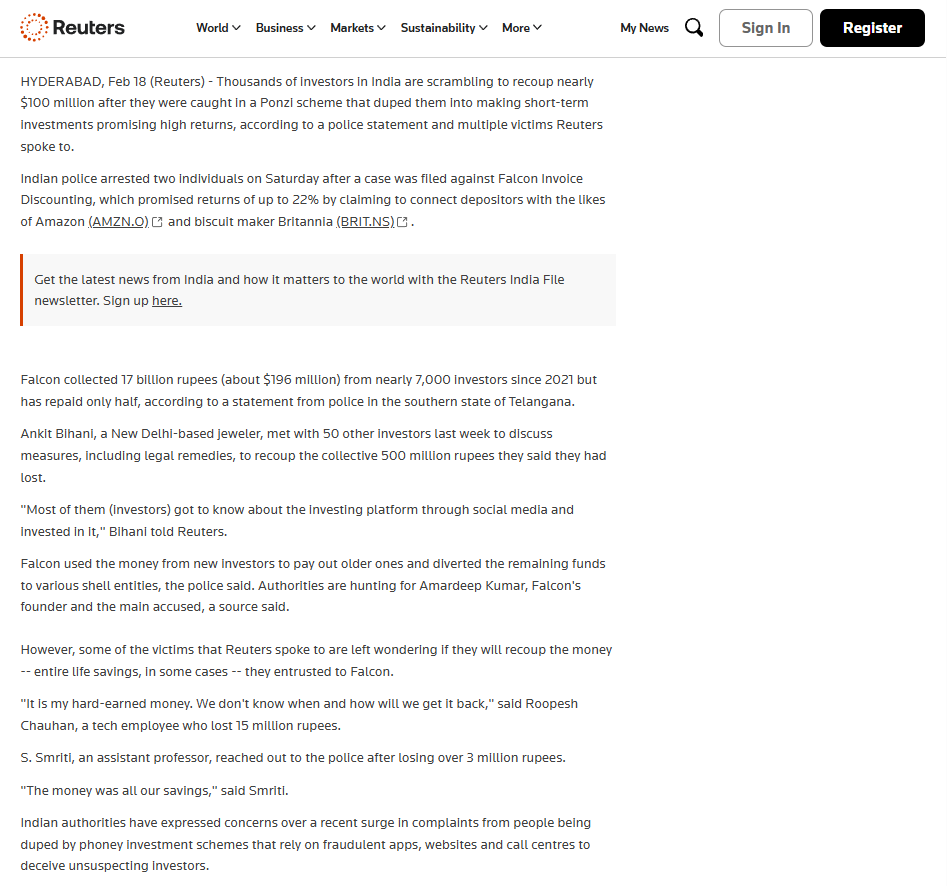 Indian police arrested two individuals on Saturday after a case was filed against Falcon Invoice Discounting, which promised returns of up to 22% by claiming to connect depositors with the likes of Amazon and Britannia. Falcon collected 17 billion rupees (about $196 million) from nearly 7,000 investors since 2021 but has repaid only half, according to a statement from police in the southern state of Telangana.