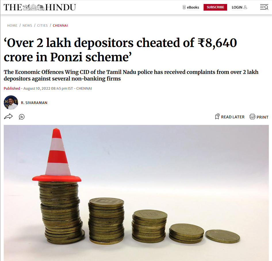 Over 2 lakh depositors lodged complaints against several non-banking firms accusing them of cheating them to the tune of approximately ₹8,624 crore in the last few months by luring them to invest in Ponzi schemes, said Economic Offences Wing (EOW) CID of Tamil Nadu Police.