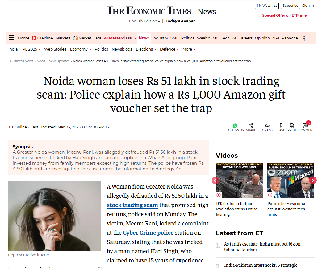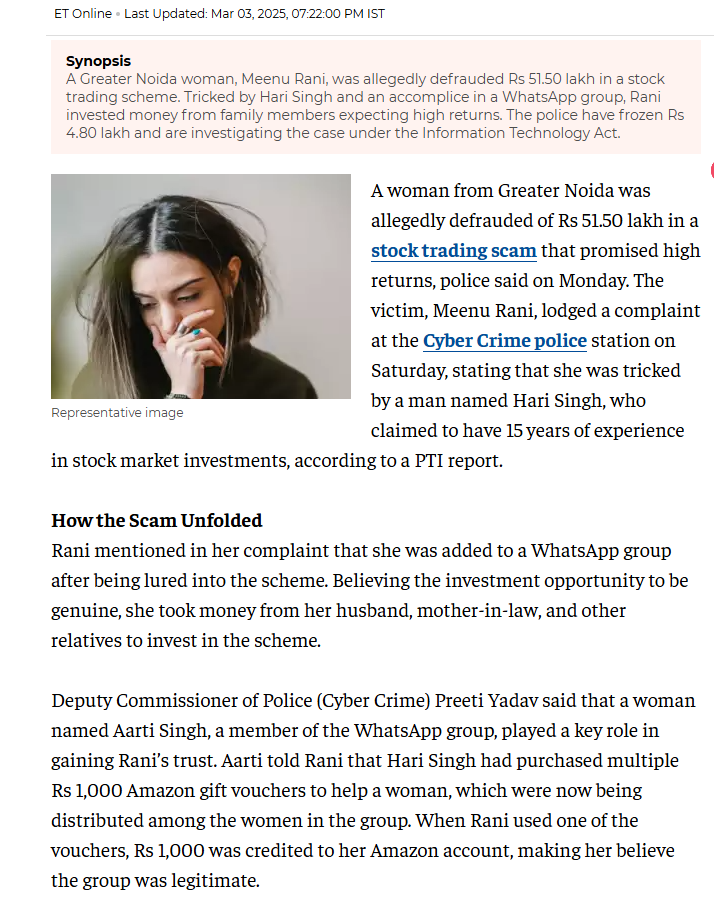 A woman from Greater Noida was allegedly defrauded of Rs 51.50 lakh in a stock trading scam that promised high returns, police said on Monday. The victim, Meenu Rani, lodged a complaint at the Cyber Crime police station on Saturday, stating that she was tricked by a man named Hari Singh, who claimed to have 15 years of experience in stock market investments, according to a PTI report.