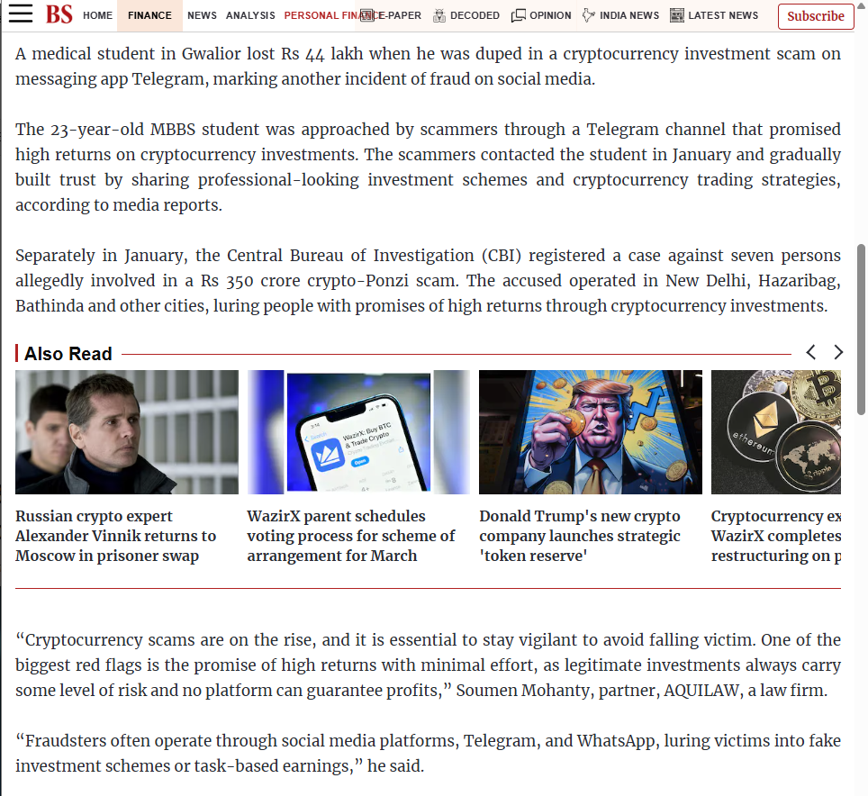 A medical student in Gwalior lost Rs 44 lakh when he was duped in a cryptocurrency investment scam on messaging app Telegram, marking another incident of fraud on social media.
