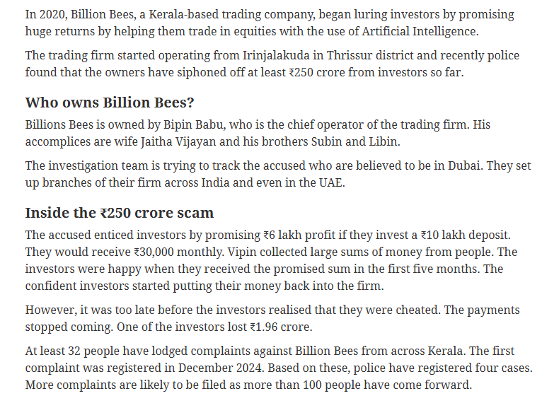 At least 32 people have lodged complaints against Billion Bees from across Kerala. The first complaint was registered in December 2024. Based on these, police have registered four cases. More complaints are likely to be filed as more than 100 people have come forward.